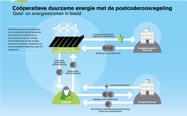 Er wordt bij dit project gebruik gemaakt van een subsidieregeling ‘Verlaagd Tarief’, de zogenaamde Postcoderoosregeling. In 2021 opgevolgd door de zogenoemde postcoderoossubsidieregeling. Hierbij is geen sprake meer van een belastingkorting die direct aan de leden wordt terugbetaald, maar van een subsidie die wordt uitgekeerd aan de coöperatie.